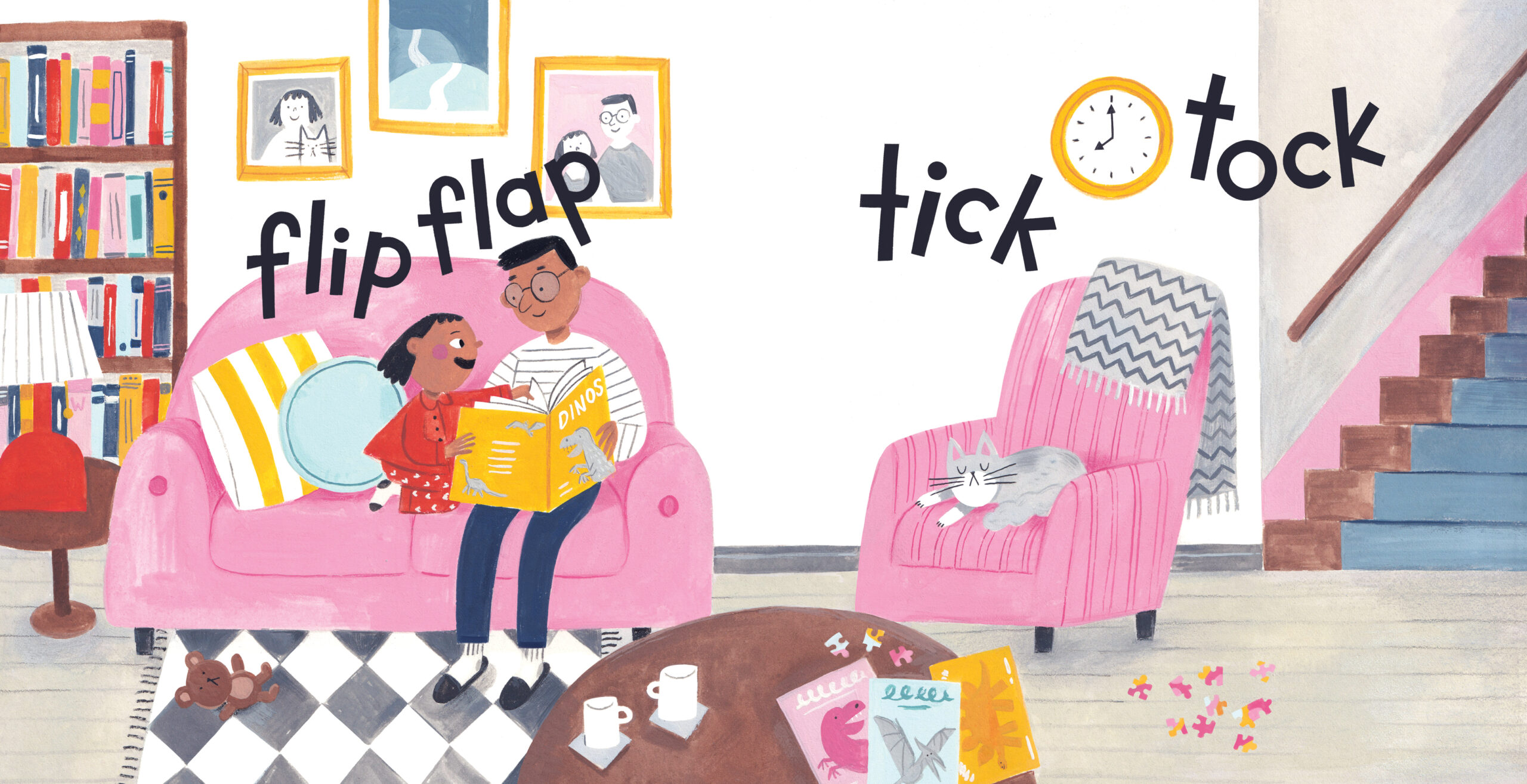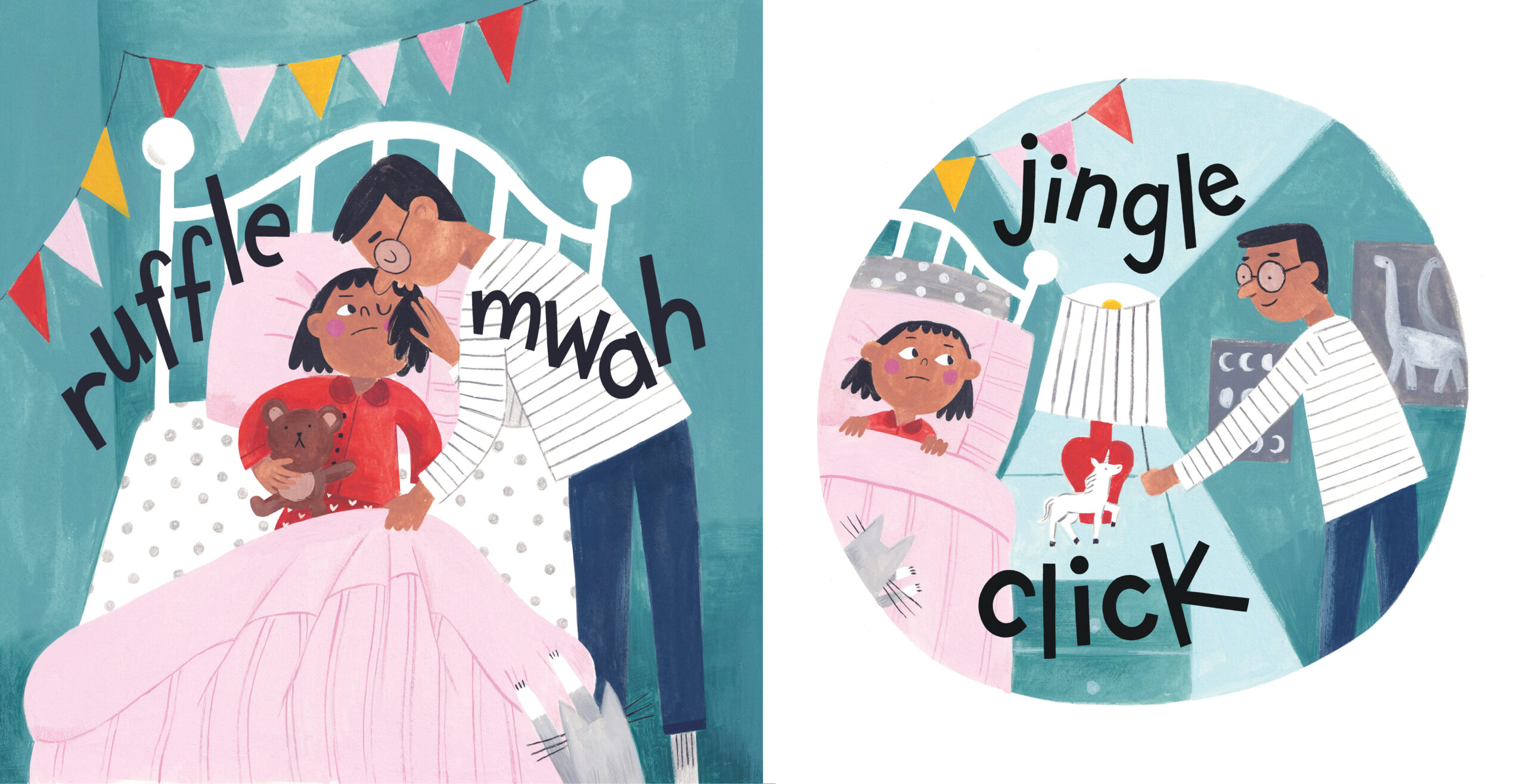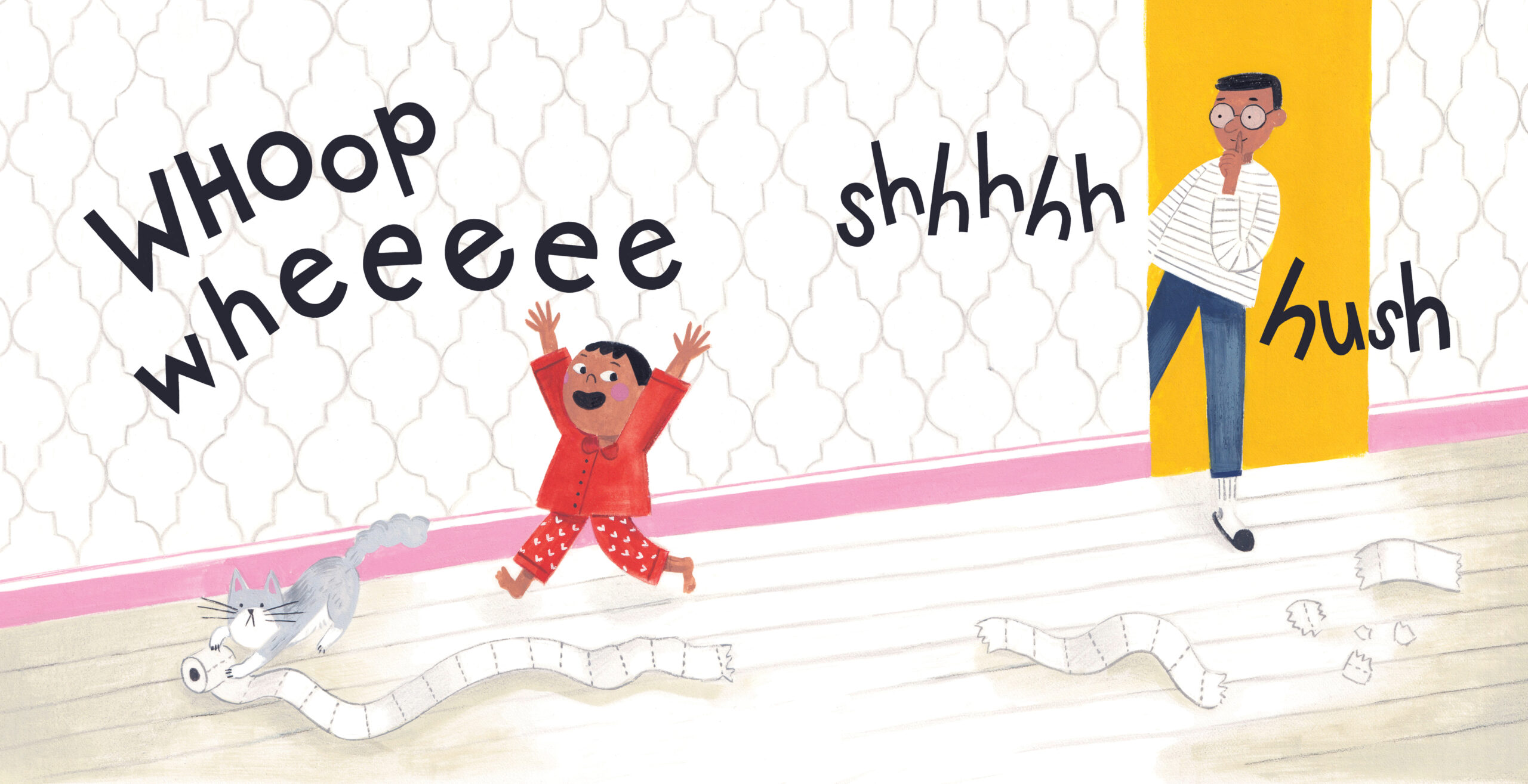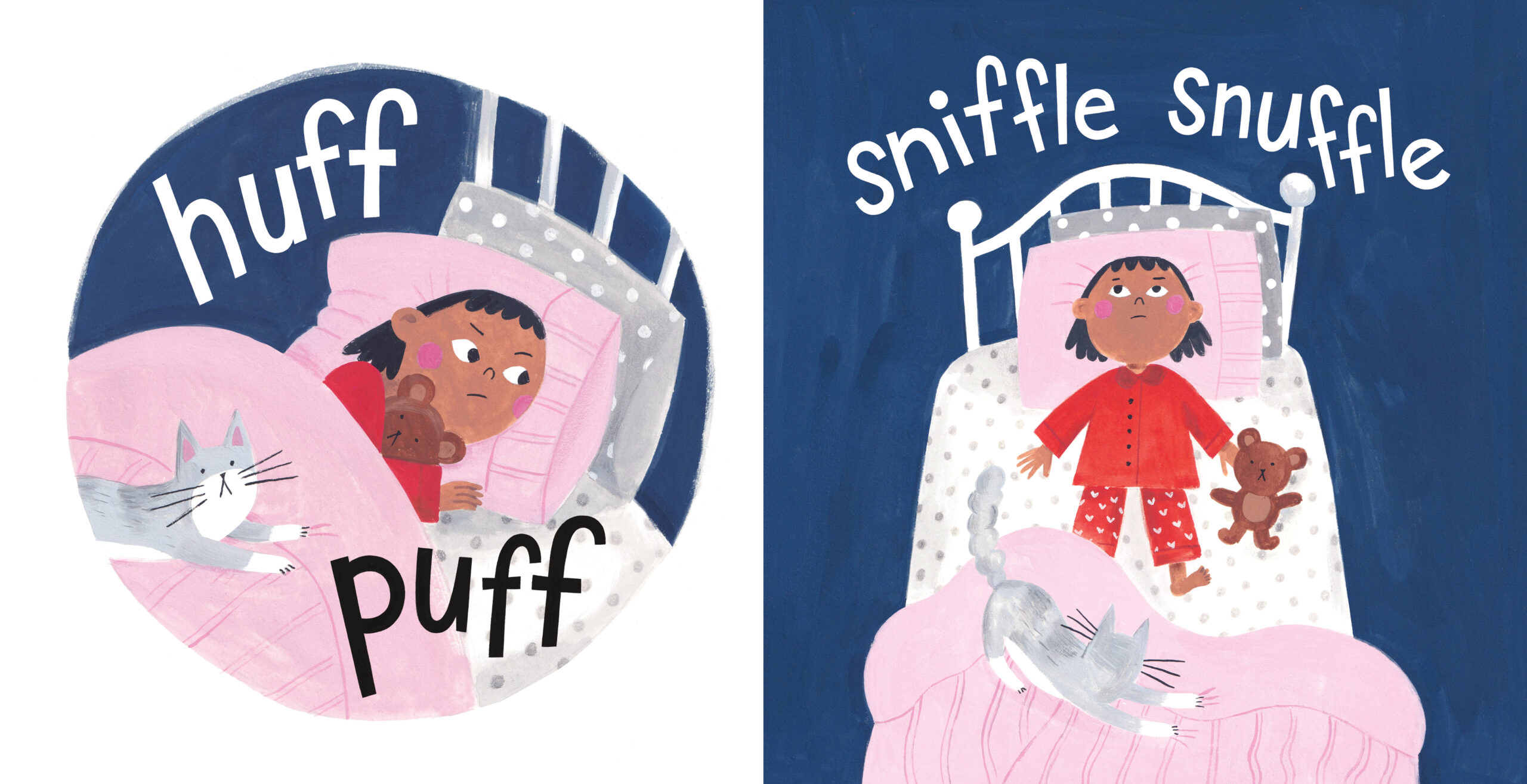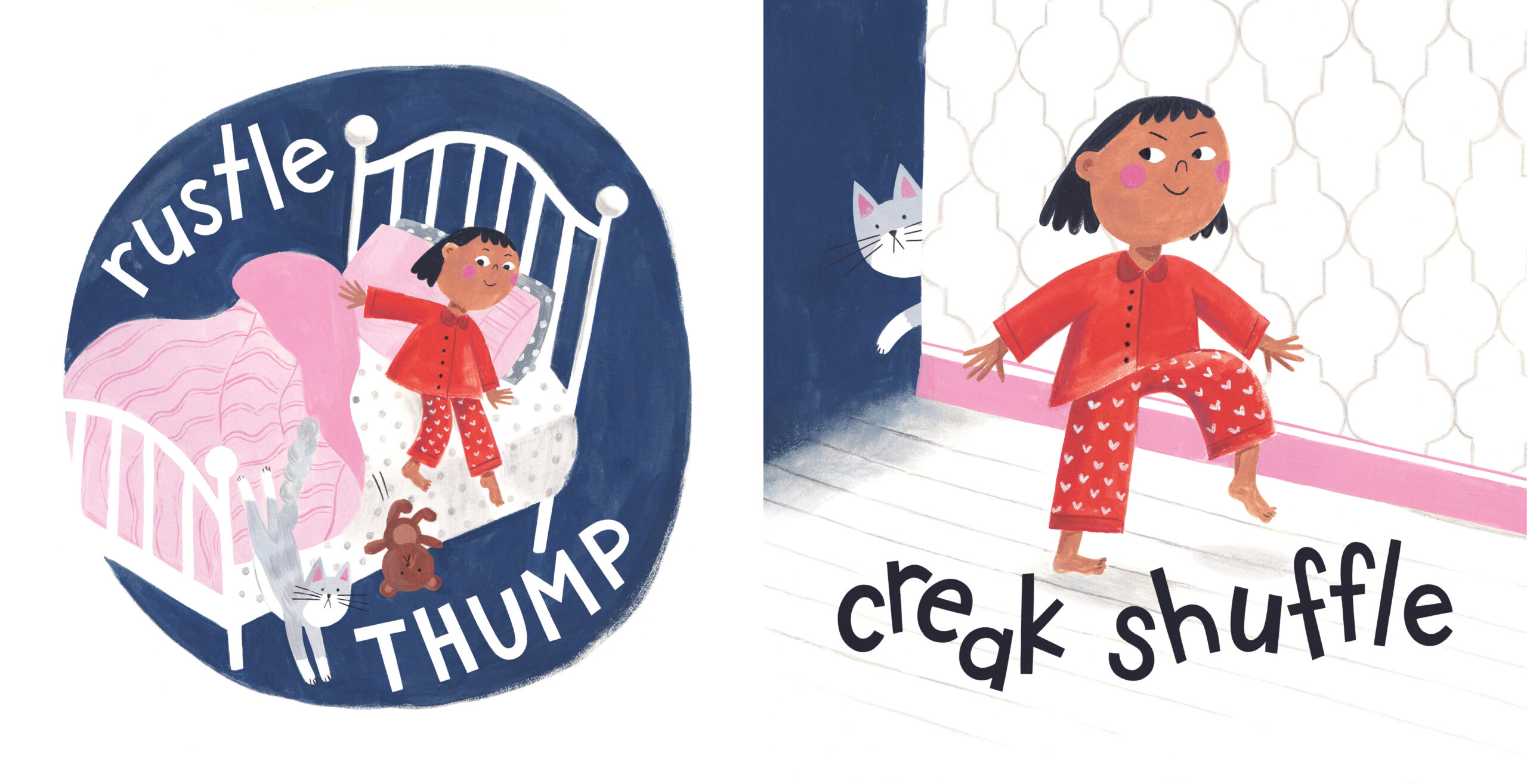Grumble Yawn follows the onomatopoeic antics of a young girl and her cat as they resist the bedtime routine.