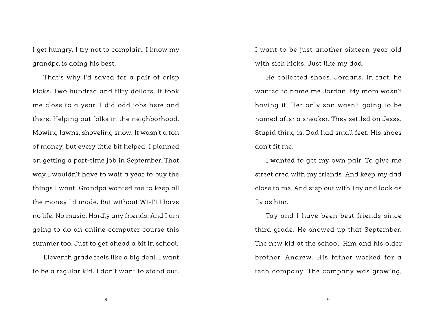After his parents were killed in an accident three years ago, Jesse went to live with his grandfather, and it wasn’t long before the insurance money ran out. That meant no money for new threads or fresh kicks. Now with summer in swing, Jesse has been saving for new sneakers. He’ll finally be able to keep up with the rest of the kids at his school, especially his best friend, Tay Matthews, whose sneaker collection could be housed in a museum. But then his grandpa’s WiFi is cut off and Jesse has to hand over his savings to pay the bill. It looks like Jesse’s plan for new shoes is trashed. That’s until nineteen-year-old smooth-talking Derick rolls into town. With new threads and a fresh ride, Derick shows the boys there’s more than one way to get what you want. And Jesse must decide how much he is willing to pay.
