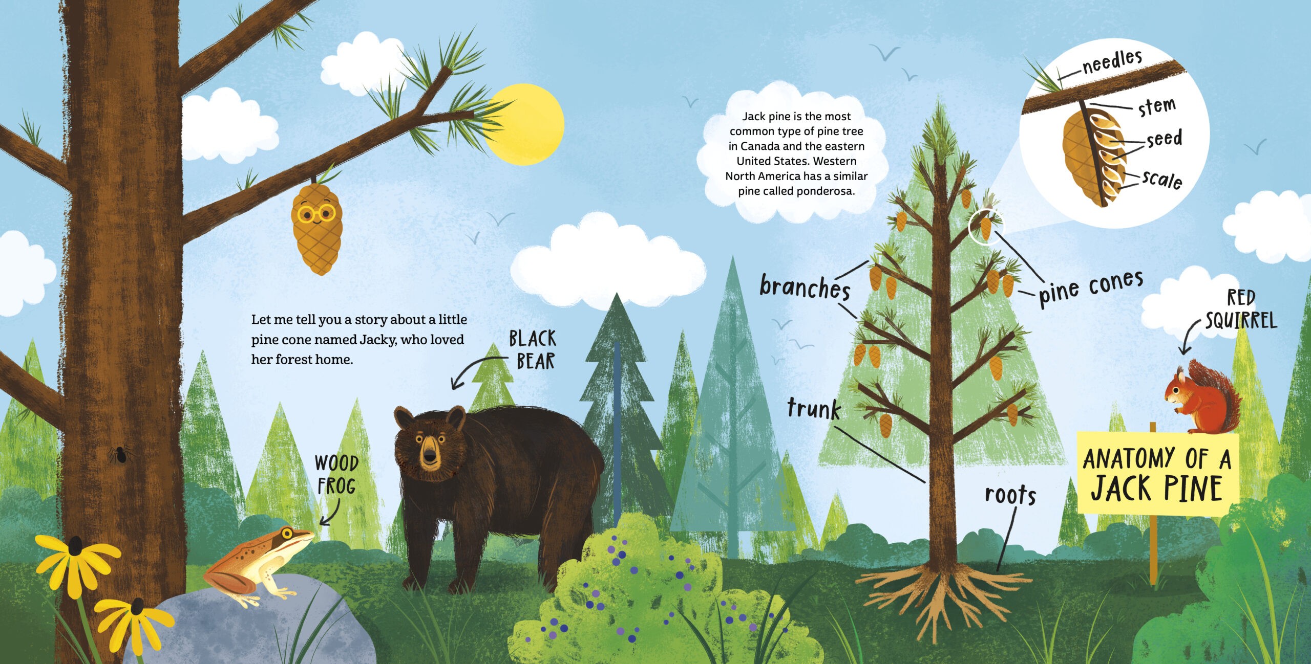 Little Jacky is a Jack pine cone who loves living in the woods with all of her animal friends. When a fire breaks out in her forest, all her friends run to safety and the firefighters battle the flames. The fire threatens to get too close to a neighboring village and Jacky watches as the people who live there, and the fire crew, take measures to make sure everyone is safe. While the village is protected from the fire, Little Jacky is scorched by the flames and finds out that the heat is important for her to continue her life cycle.