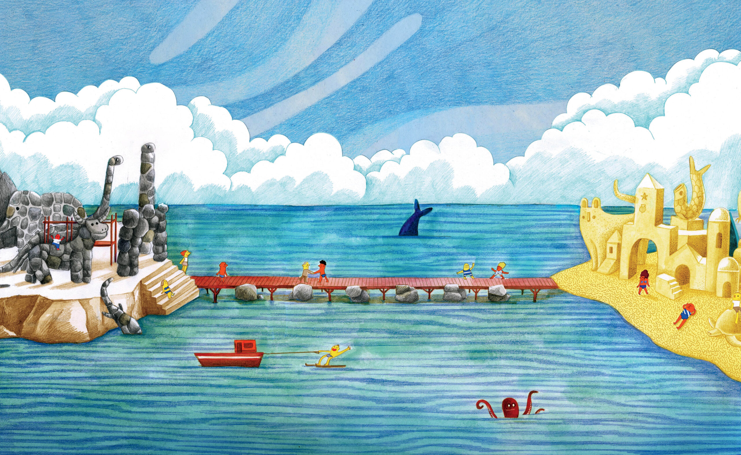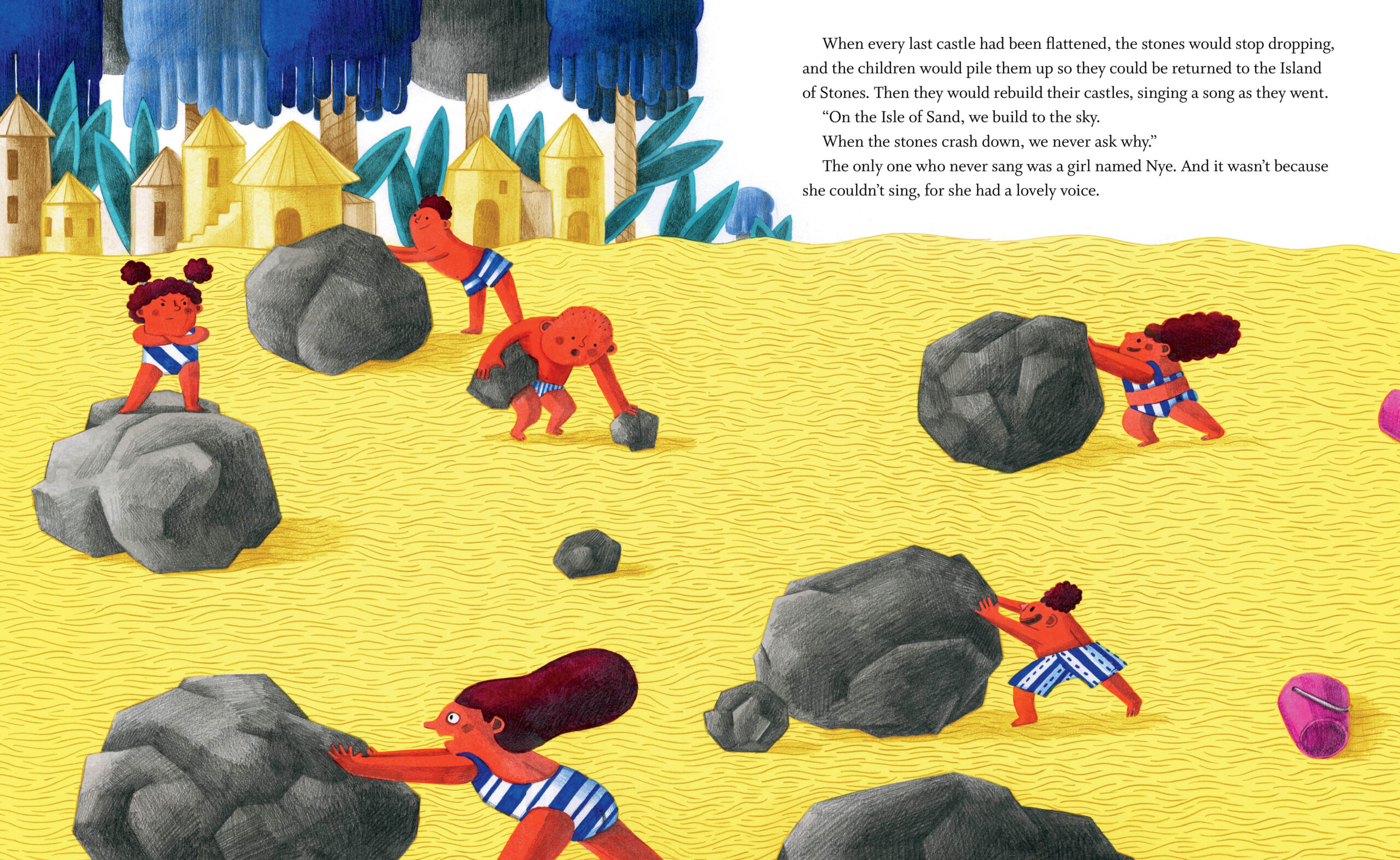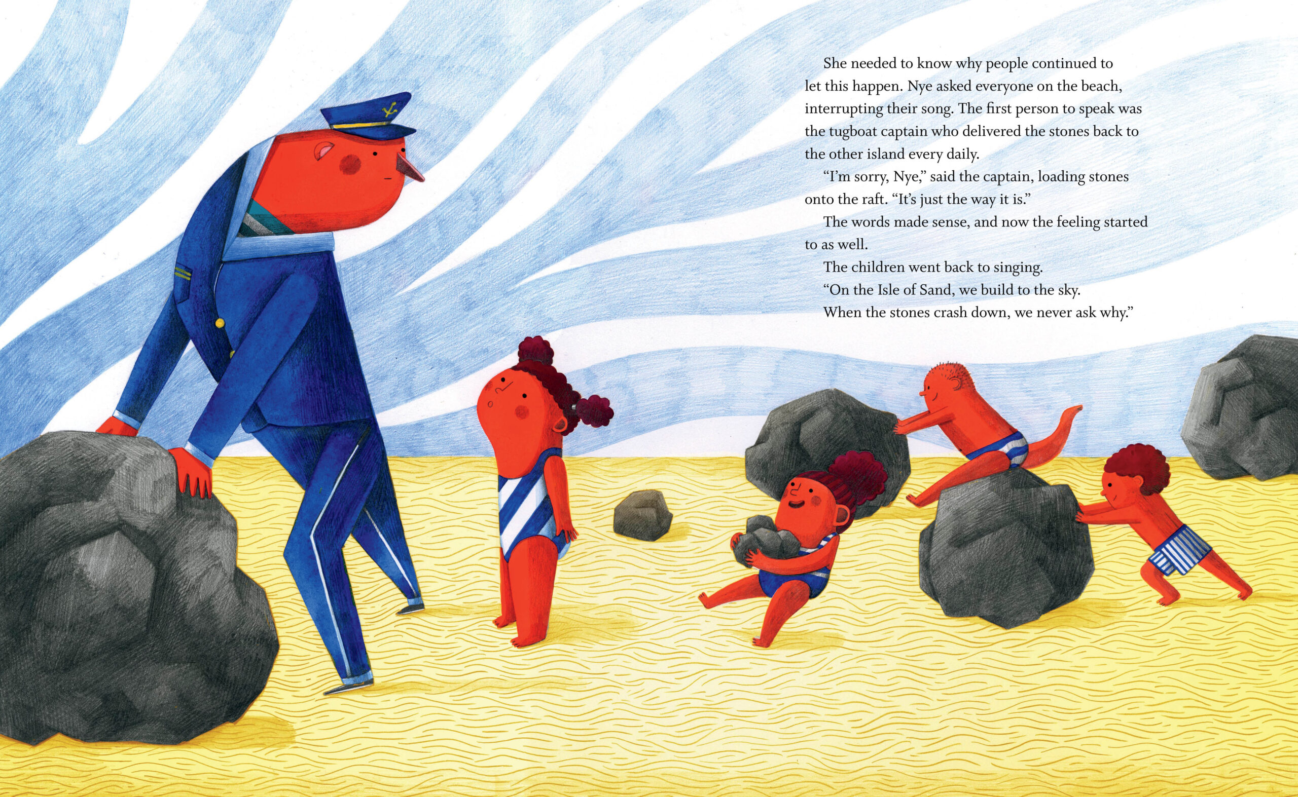 Young Nye doesn’t understand why the people on her Island of Sand work so hard to build beautiful sandcastles every day if they are destined to be ruined by the stones catapulted over by the people of the Island of Stones every evening. When she asks “Why?” all she ever hears in response is “Because.”