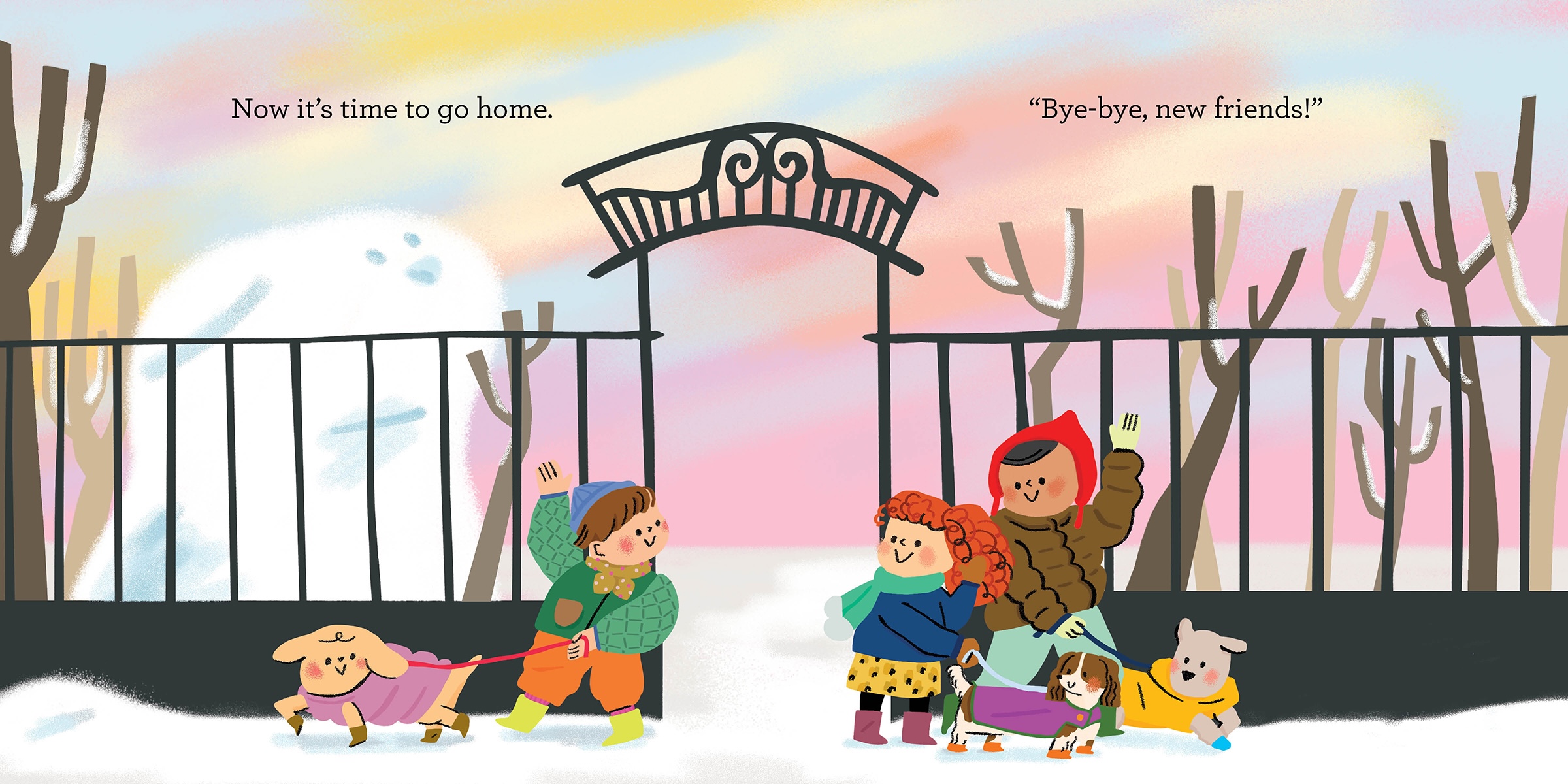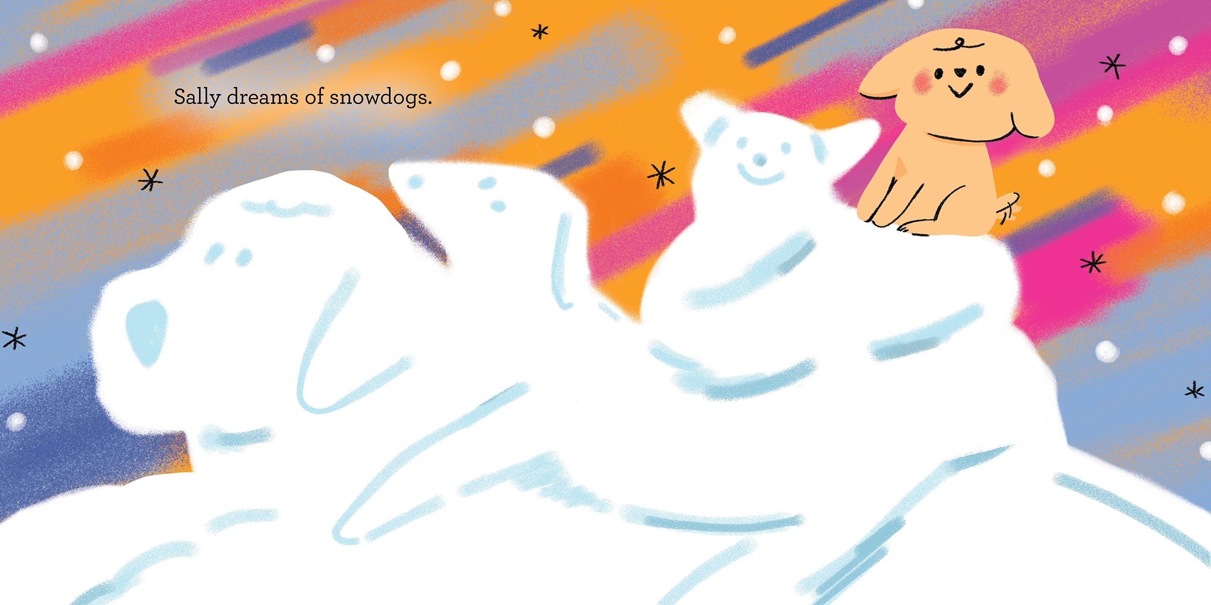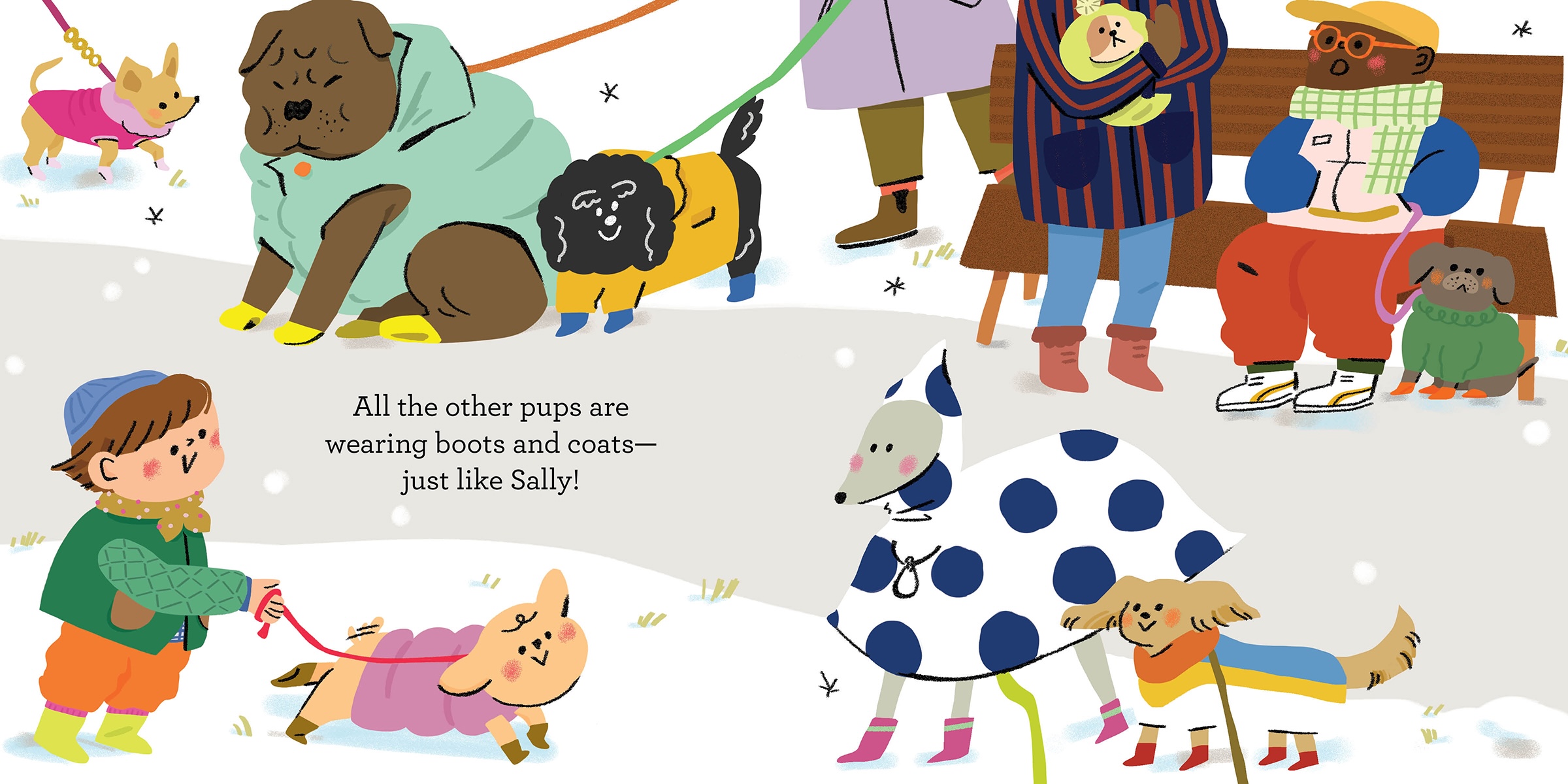 It’s a winter’s day and Sally the dog is headed to the park! But first she has to put on some warm clothes: coat and boots. It’s not easy to zip up a pup, but finally she’s ready to sniff and snout her way through the snow. At the park she finds other pups to play with and sees people rolling snowballs to make snowdogs of all shapes and sizes! Sally sniffs them all before saying goodbye to her new friends and heading back home for a well-earned snooze.
