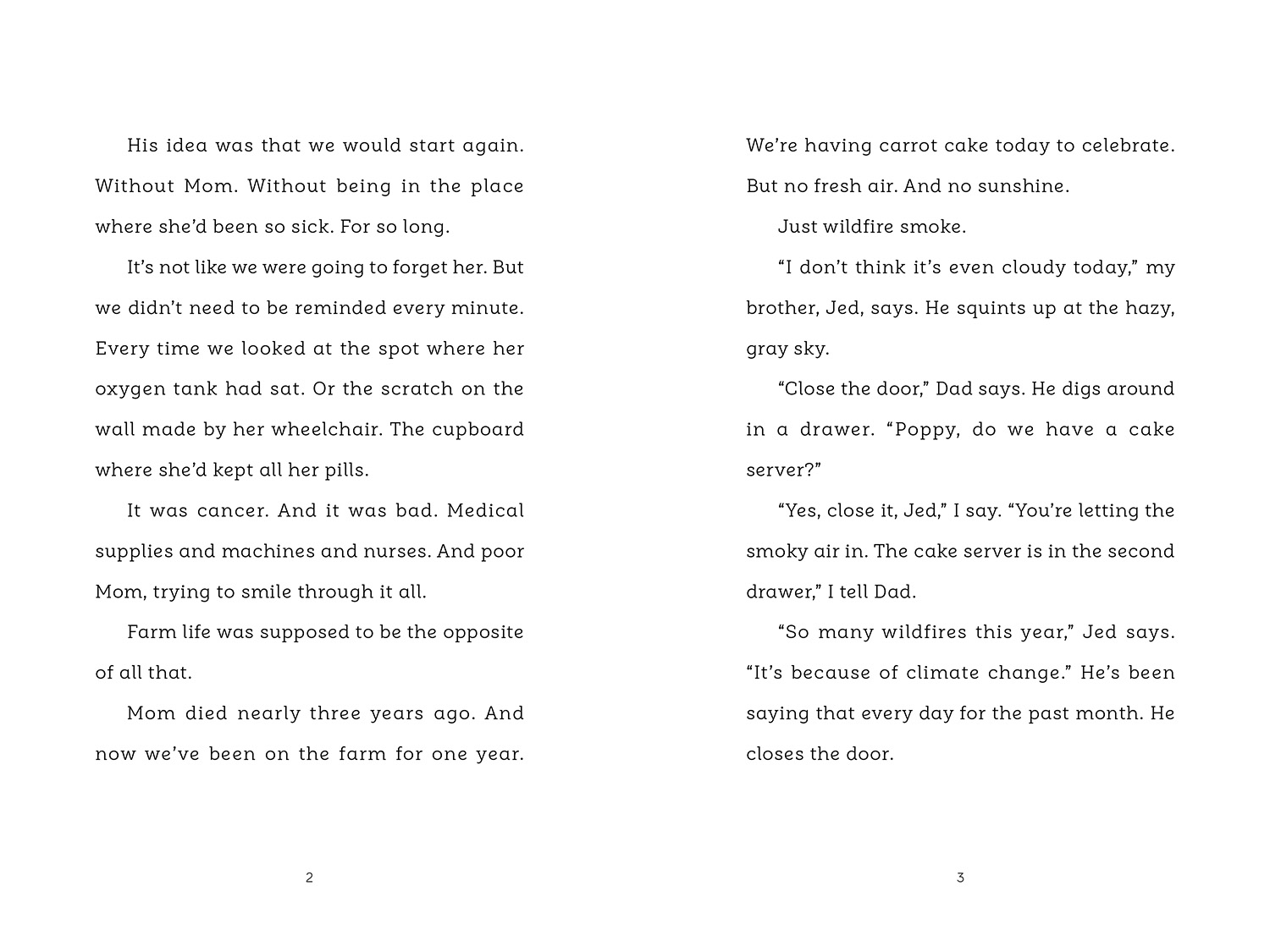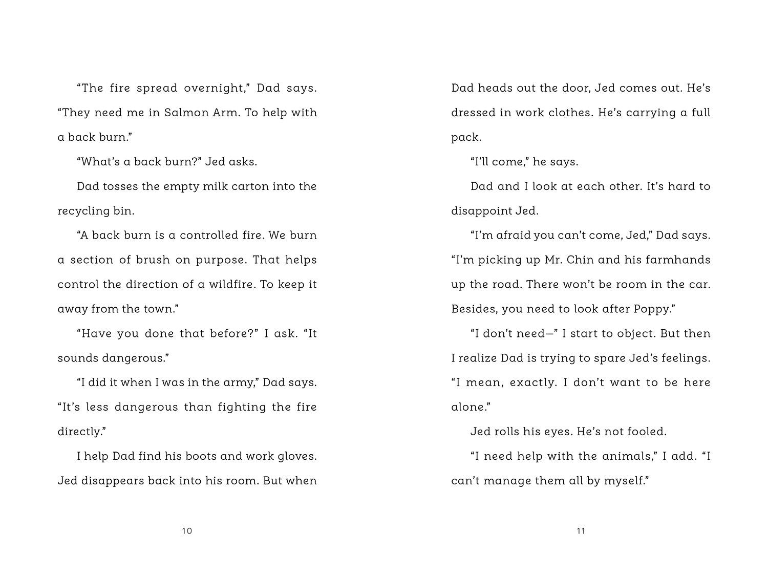 So when Poppy’s widowed dad leaves her and her brother while he helps fight a distant wildfire, she’s confident she can manage. Her brother Jed has a disability and sometimes needs support, but there’s plenty to keep them both busy around the house and the farm. They’ll be fine. Then the wind changes and the wildfire heads straight for the farm. With no word from their dad, Poppy and Jed know they should get to safety, but what will they do with the farm animals? As the air fills with smoke and flames flicker on the horizon, Poppy and Jed must gather their unlucky collection of animals and make a desperate escape.