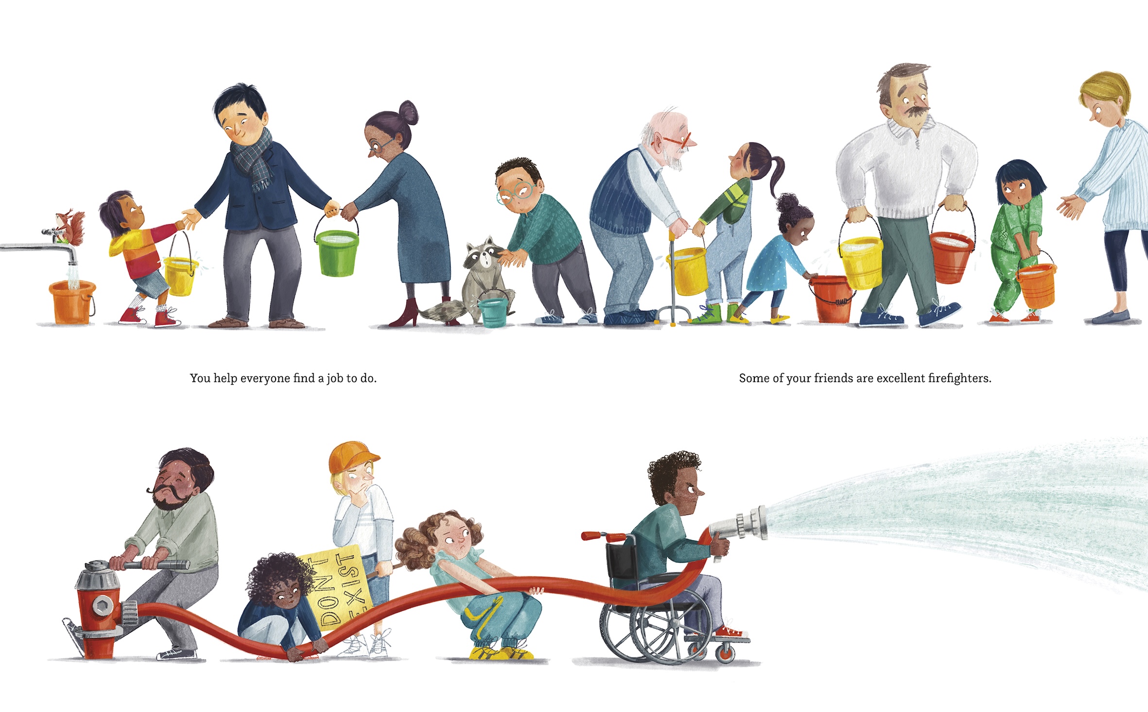It’s a normal day in your normal town. You are all alone when you spot a dragon overhead. You know you can’t defeat it by yourself, so you call for help. Your friends, family and neighbors all band together. Some do the firefighting, some try to reason with the dragon and some are fierce and fearless. Just when it seems the beast has won, more people arrive and rally against it. Finally, the dragon flees! And now, if it ever comes back, you’ll be ready to face it with your community. Together.